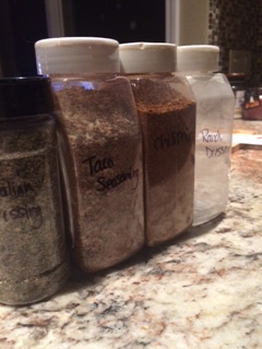 Now, what do I do with all these spices and herbs other than my regular dinners?  I make spice blends!!  I have really moved away from packets for a lot of reasons–think taco seasoning, chili seasoning, and salad dressings.  One reason is that they are FULL of sodium.  I am not a health nut by any means.  But I do try to cut back where I can.  Those packets taste so damn salty to me.  Probably because of reason number 2–the MSG!!  So much of it is lurking in your packets as well as your bottled salad dressings.  It gives me major headaches.  This is one way I’ve gotten around that.  Number 3 is that they just taste better.  I can add what I like and remove what I don’t.  Not a fan of cilantro?  Eliminate it.  Prefer a little more kick?  Add some cayenne.  Finally, it’s so much cheaper.  I don’t usually use expensive, hard to find spices.  I can get most of them at Aldi–have I professed my love for that place?  They are under a buck there.  Make a blend that is equivalent to 10 packets and you have really saved a bit of cash.