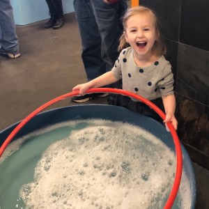 Upon waking, she was ready to go. She picked out a dress and some leggings–her new go-to ensemble. We packed our own snacks and patiently waited for grandpa to walk through the door. We arrived at the museum just 45 minutes after opening but we still couldn’t find a parking spot. We walked skipped from a nearby school parking lot to find ourselves engulfed in a spring break crowd of toddlers through preteens we were not quite expecting.