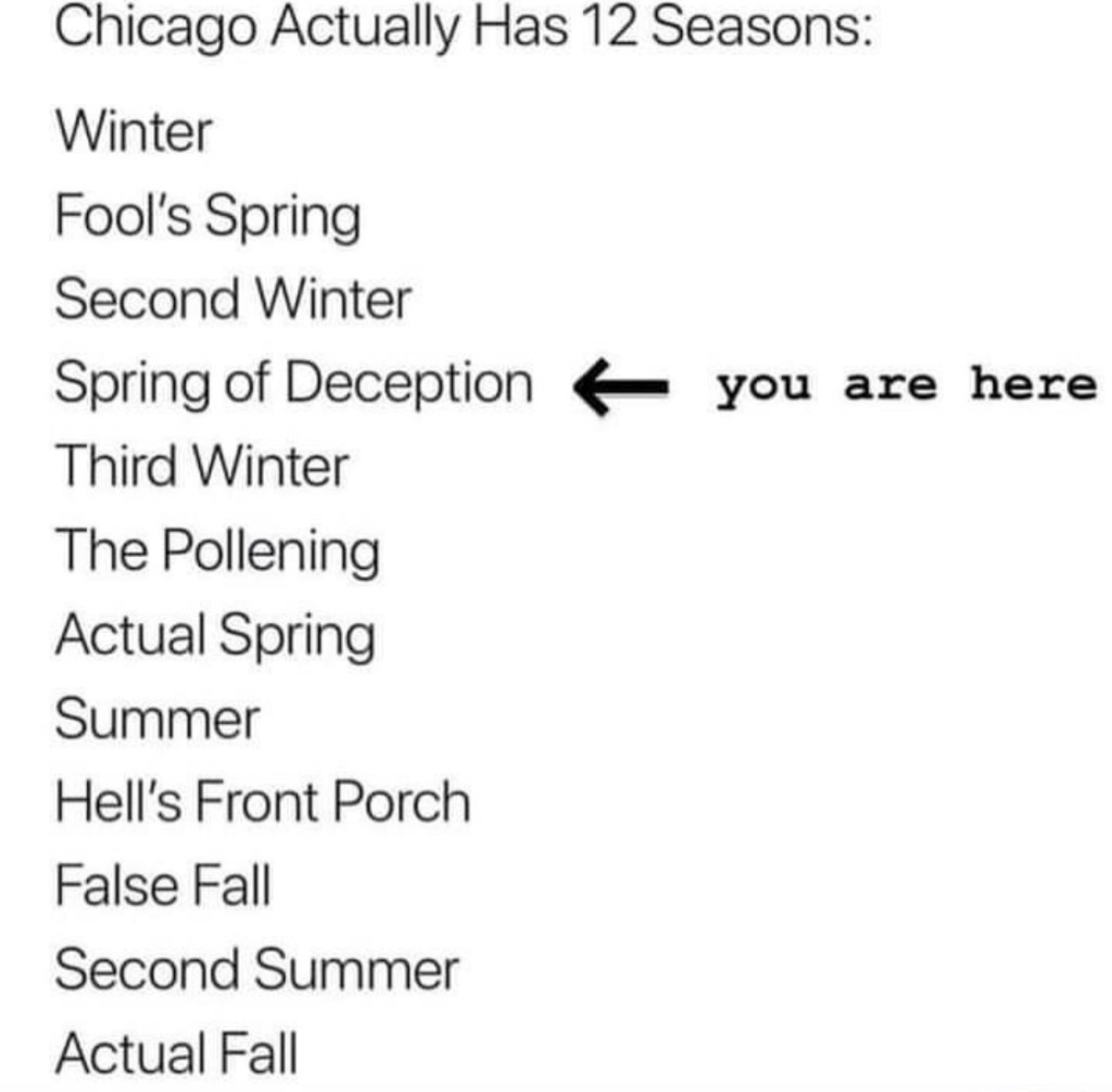 I think everyone’s moods were lightened by such a beautiful day. And tomorrow will be even nicer. I’m hoping that we can enjoy these longer daylight hours and warmer weather. I hope Mother Nature hasn’t tricked us into a Spring of Deception. Based on my allergies, I would guess we are firmly in The Pollening. I’ll be keeping my snow brush in my car just in case, though. You should, too. Because if you take it out, you have guaranteed 8-10 more inches of snow. Don’t be that guy.
