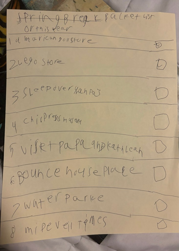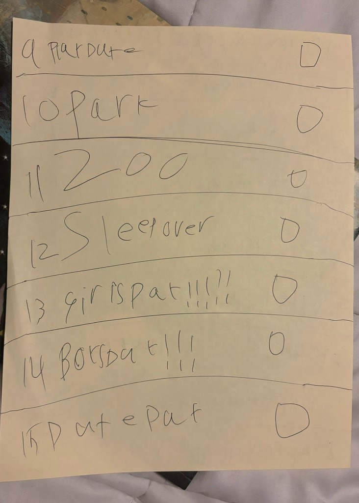 McKenna did the writing while everyone else contributed. We turned it into a 2024 Bucket List due to the extent of their grand plans. Let me translate her primitive handwriting and 3rd grade spelling.
