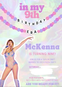 We had ideas for a spa party, pool party, movie party. Then there was the game party and the dance party ideas. Of course, a bunny themed idea was considered. She finally settled on something through the park district. It’s a tie-dye party with a Taylor Swift twist…a little TS inspiration if you will.