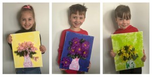 Today I wanted to get a jump on what will go up when the bunnies come down after this weekend. I was going to have them make a flower project using the same method as the bunnies but I just couldn’t figure out how to make it work. Then while at the Dollar Tree, inspiration struck. They each painted the canvases the color of their choice using paper towels pinch with a clothes pin as the paint brush. McKenna liked to dab, George preferred to make lines while Theo did swirls. I cut out vases from cardboards. The kids then rolled and shook a ping pong balls in paint over them to create the marble look. They glued the vases and Dollar Tree flowers to the canvas to create these awesome 3D flower displays for the spring.