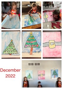 Some of our favorites have been the water color Christmas design using black paint in white glue to create the outlines. The big kids drew their own tree with some guidance and then added the garland and ornaments. I outlined them with the glue and they did all the water colors. For Theo’s, he just had to draw a couple of lines and a rectangle then do his best to stay in the lines while painting. He wasn’t even 2 at the time.