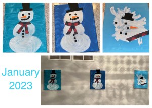 Next we needed to replace Christmas with winter. We created one of my all time favorite to do with my students—snowmen. It’s perfect because some turn out exactly like snowmen. Others look a bit…melty. They are all adorable.