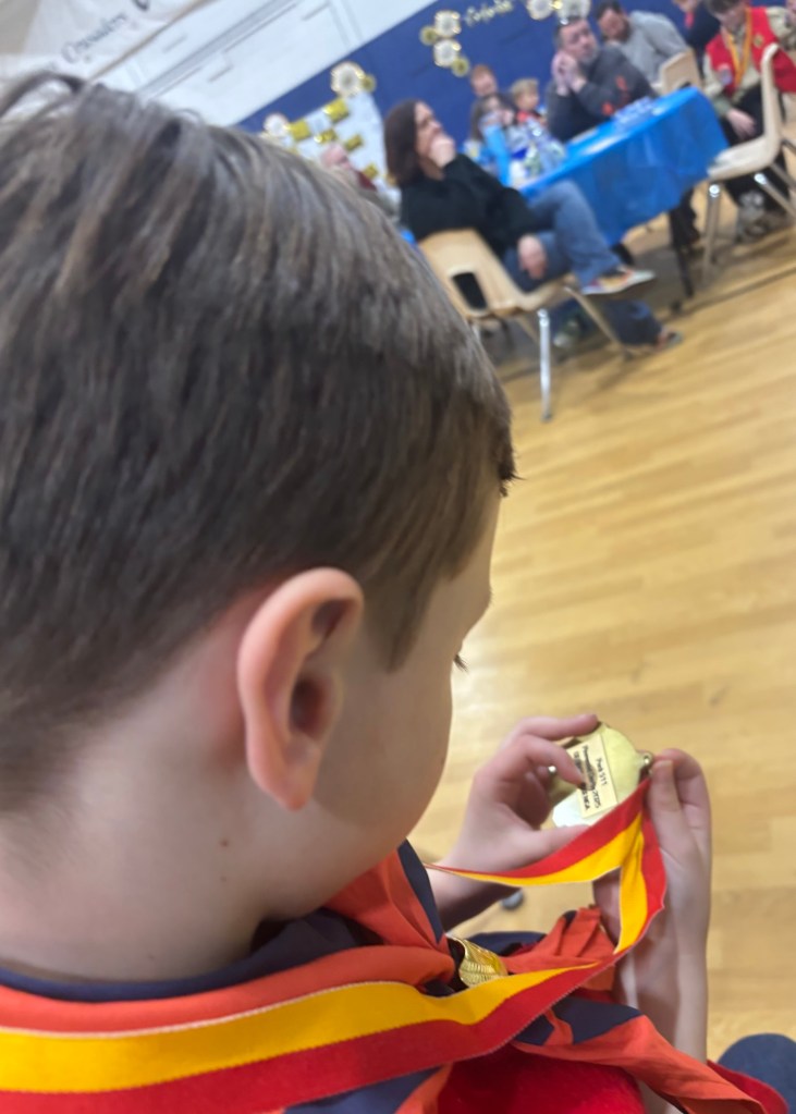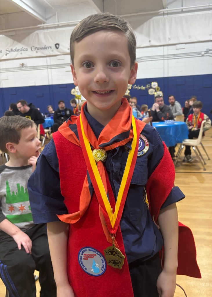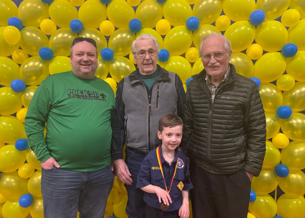 Today we celebrated George’s Boy Scout Blue & Gold Dinner. Like last year, Regular Grandpa and Great Grandpa joined us. And although no one was sick this year, everyone was exhausted from the Daylight Savings Time transition and too much fun at their sleepovers last night.