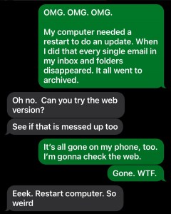 In a panic I sent in a ticket to IT while I mentally had a breakdown. It turns out that everything…and I mean EVERYTHING…had somehow been moved to my archived folder. How? No one can say. But as someone who gets sometimes 100+ emails a day, how was I supposed to weed through all those messages to reconstruct my digital to-do list?! I wanted to cry.