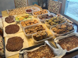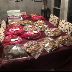 We preheat both our ovens (we are very fortunate for this), don our aprons, and start baking dozens and dozens of cookies. This past Cookie Day, I estimated that we baked about 60 dozen cookies plus 3 batches of fudge and 2 pans of bar cookies. We had about 15 different varieties of treats.