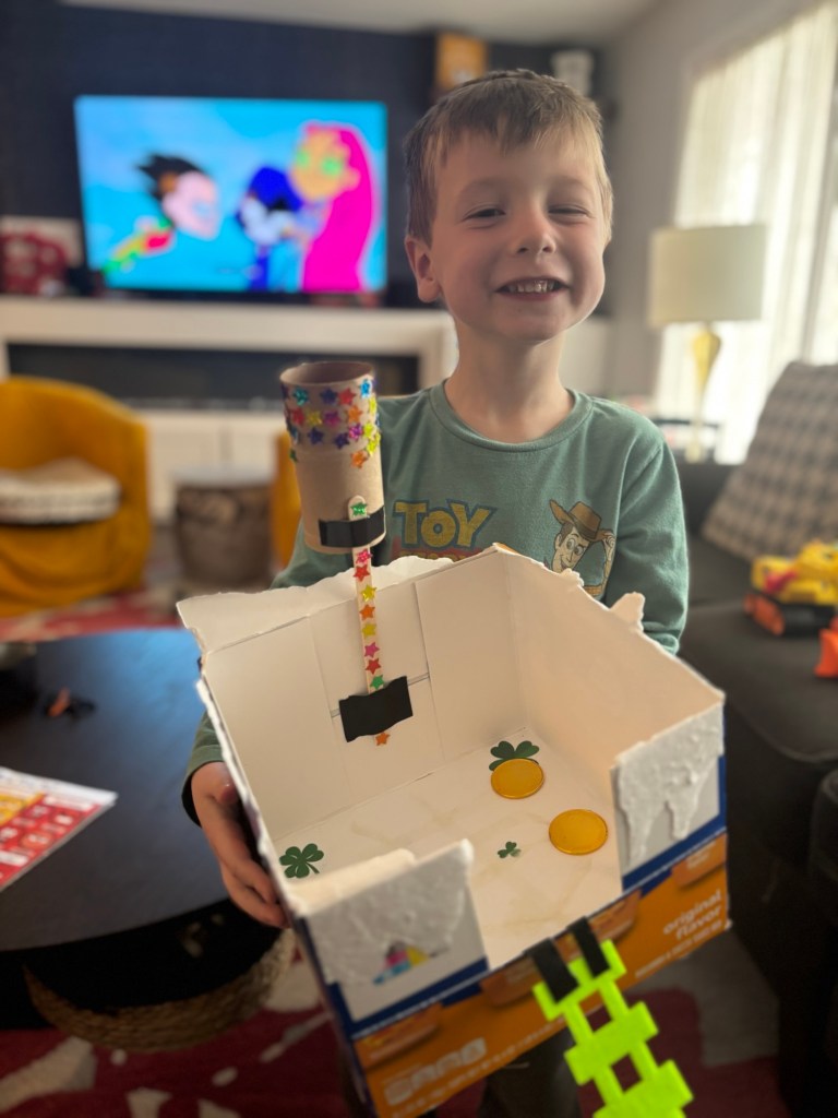 Anyway, George taped and glued and constructed until his heart was content. It was a little wobbly but nothing some gorilla tape couldn’t fix. I will forever be doing Leprechaun traps this way. Plug and chug…not glitter necessary.