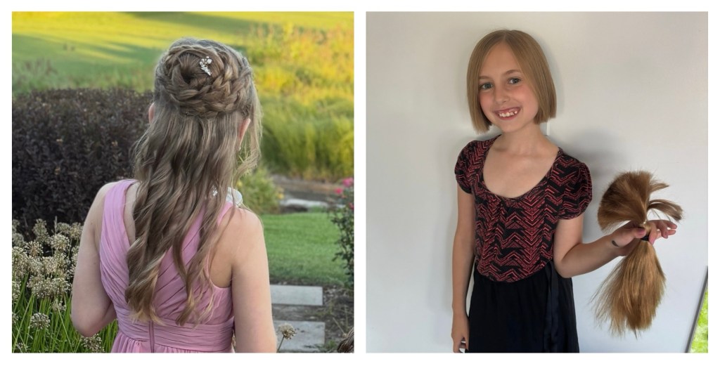Several years later, she wanted to donate it again. It was a bear to maintain and was frequently in her face or food. So I brought her to a big girl salon. She loved it. We sent 12 more inches to Children with Hair Loss for donation. Then she promptly started growing it again.